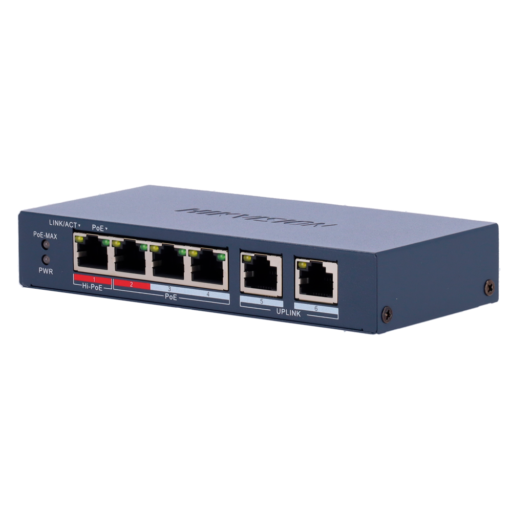 - 4 puertos PoE+ RJ45 10/100Mbps + 2 Uplink 10/100Mbps