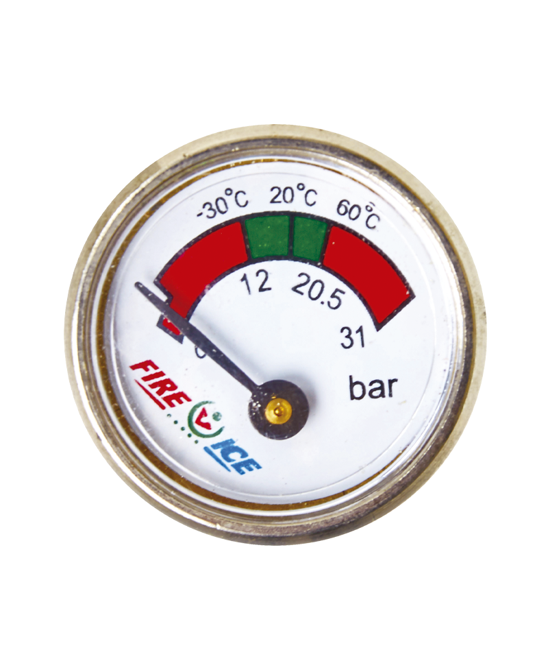 Indicador de presión Ø 27 mm Indicador de presión, válido para válvulas FI 60. Dimensión: Ø 27 mm. Material: latón cromado de alta calidad. Escala: 0-31 bar. Incluye: Filtro y junta de estanqueidad. Certificados: Certificado Aprobación Certificado Calidad Certificado Extintores Portátiles