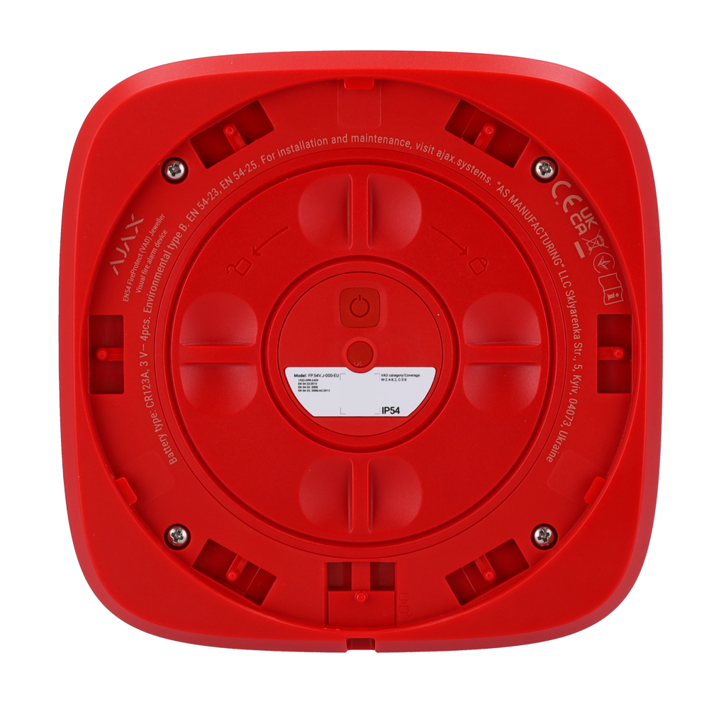 AJ-EN54-VAD-R es un Flash-dispositivo inalámbrico de alarma visual (DAV) y direccionable, certificado conforme a las normas EN 54-23 y EN 54-25. Proporciona una potente alerta visual, facilitando una respuesta oportuna ante incendios y garantizando la accesibilidad incluso para personas con dificultades auditivas.
