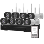 Kit profesional de videovigilancia WiFi 6 con grabador NVR de 16 canales, 8 cámaras IP de 3 Megapíxeles preconfiguradas y disco duro de 1TB incluido. Diseñado para instalaciones en viviendas, comercios y pequeñas empresas que requieren vigilancia perimetral con conectividad inalámbrica de última generación.