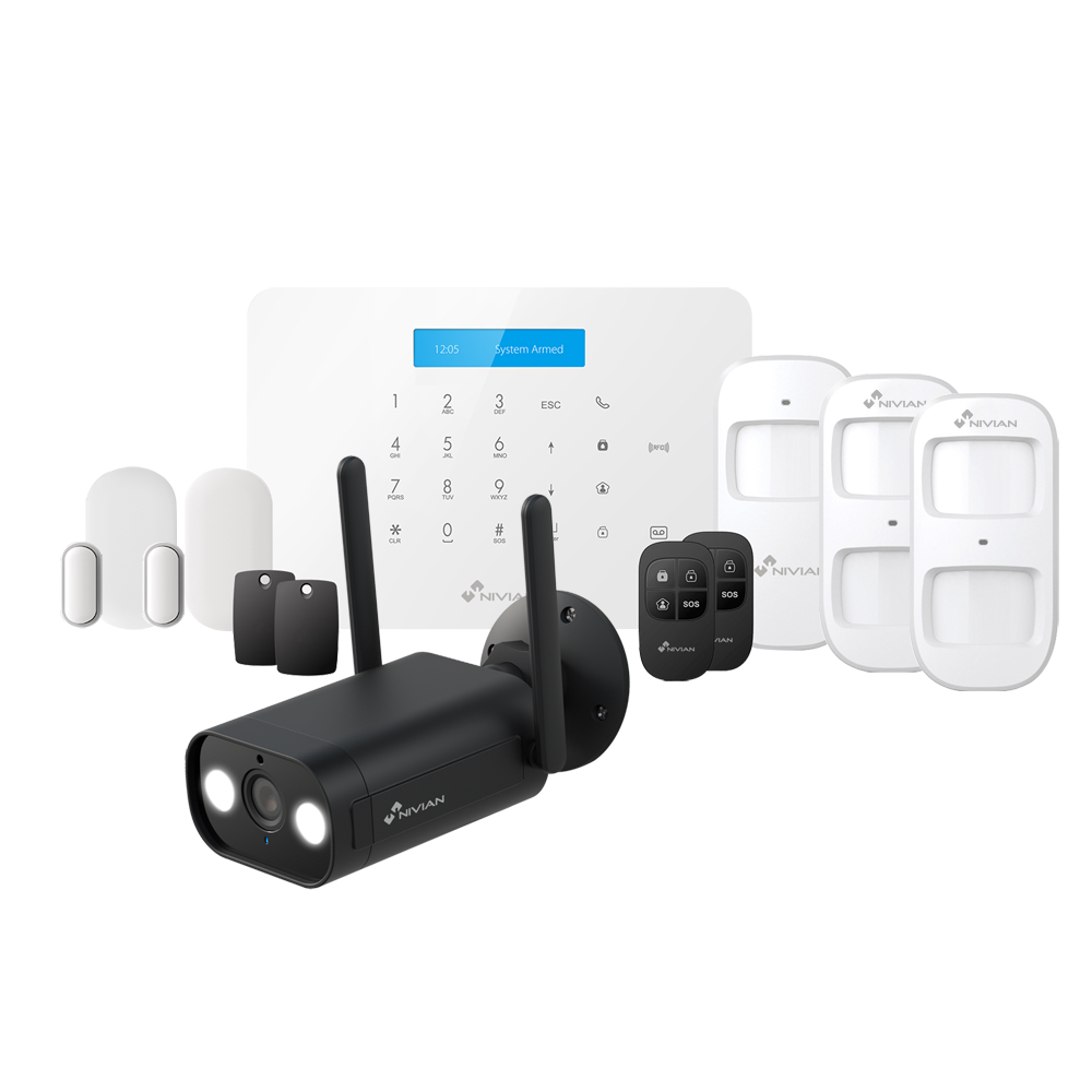 Kit completo de alarma de intrusión | Tipo: Kit profesional | Comunicación: WiFi + GSM/4G | Incluye: teclado, sirena, 1 contacto(s), 2 mando(s) | Control por app: Sí | Marca: Nivian | Ref.: NVS-A6WG-V7