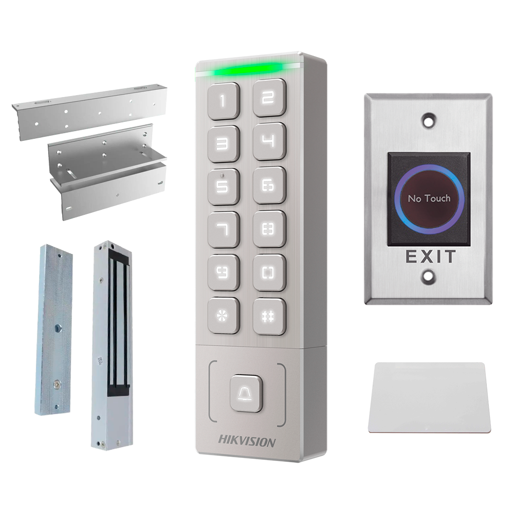 - Kit formado por: DS-K1T809EX control de acceso autónomo con tarjeta EM y PIN, DS-K4H255S ventosa magnética de 272 kg de fuerza de retención, DS-K4H255-LZ perfil en Z para instalación de ventosa magnética, DS-K7P07 pulsador de salida sin contacto y tarjeta RFID EM 125 kHz