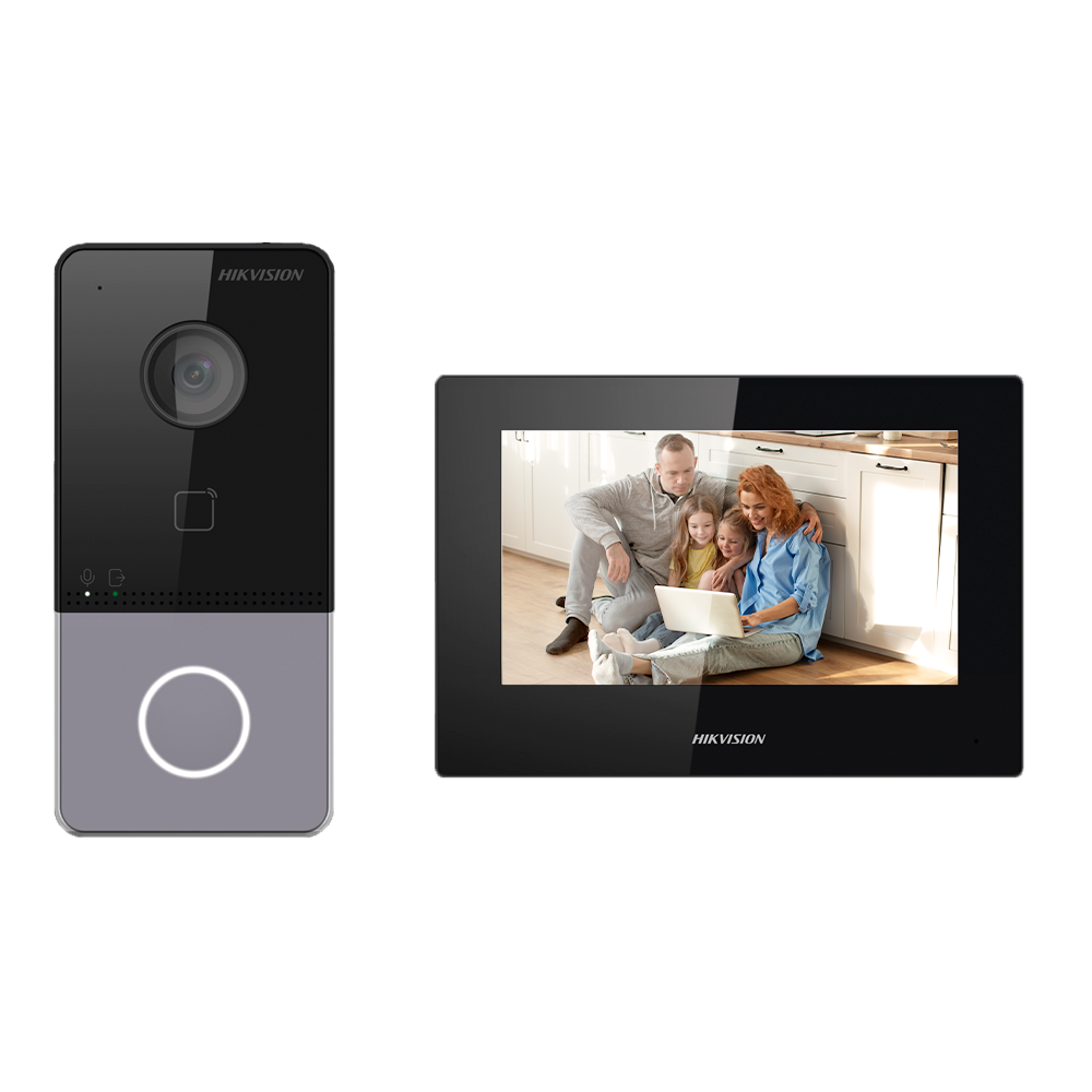 - Kit formado por: DS-KV6113-WPE1(C) placa exterior de videoportero para superficie con cámara de 2 Mpx HD y DS-KH6320-LE1(B) monitor interior con pantalla TFT LCD de 7″