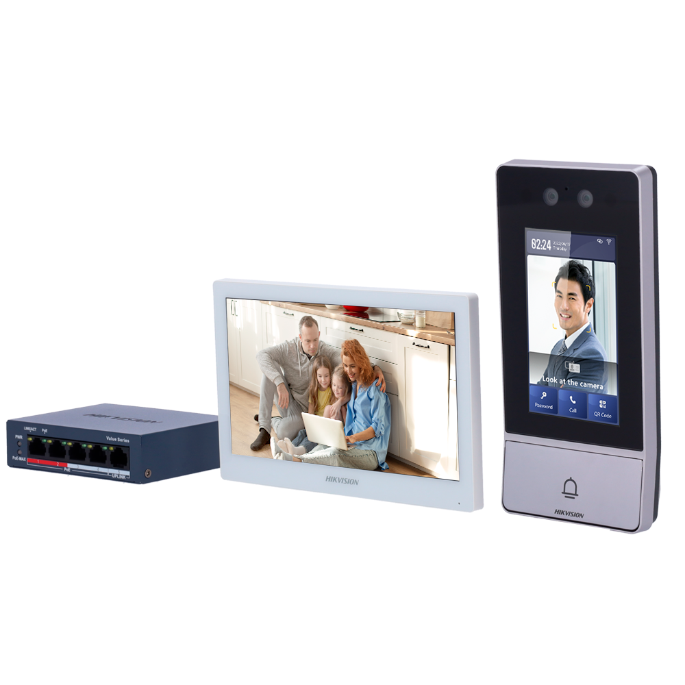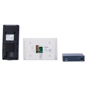- Kit formado por: DS-KV9503-WBE1 placa exterior de videoportero con reconocimiento facial y botón físico de llamada, DS-KH6350-WTE1 monitor interior WiFi con pantalla TFT LCD de 7″ y marco estrecho y switch PoE estándar
