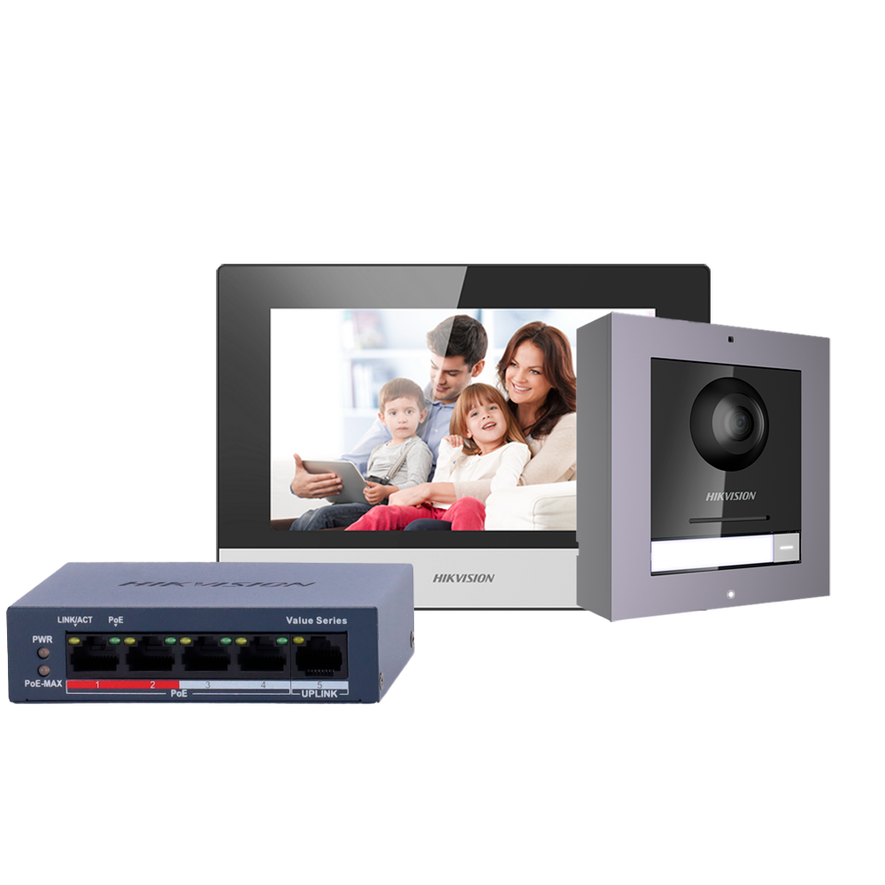 - Kit formado por: DS-KD8003-IME1(B) placa exterior de videoportero para superficie con cámara de 2 Mpx HD, DS-KH6320-WTE1 monitor interior WiFi con pantalla TFT LCD de 7″ y switch PoE estándar