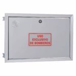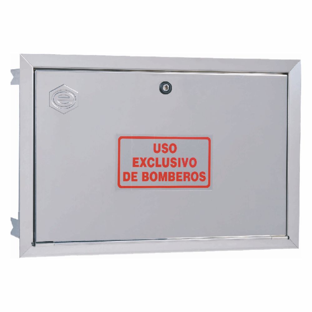 El marco EACI M41PCI presenta unas dimensiones de 428 mm de altura por 630 mm de ancho, diseñadas para alojar los componentes de toma de columna seca según normativa vigente. El material base es acero inoxidable AISI 304, aleación austenítica con excelente resistencia a la corrosión atmosférica y química, ideal para instalaciones en zonas comunes de edificios. La puerta incorpora acabado grafilado antideslizante que facilita la manipulación en situaciones de emergencia. El sistema de cierre mediante bombín con llave de cuadradillo garantiza que solo personal autorizado de los servicios de extinción pueda acceder al equipo durante una intervención.