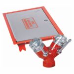 Marco de empotramiento para columna seca EACI M41PPCI-BP con válvula de bola VB1MH incorporada. Equipo completo con bifurcación de 70 mm y puerta en acero inoxidable AISI 430 grafilado. Cumple requisitos del CTE DB-SI para edificios de más de 24 metros de altura de evacuación.