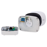 El diseño compacto tipo bullet facilita la instalación en espacios reducidos, mientras que el sistema de montaje versátil permite ajustes precisos de orientación. La alimentación PoE (Power over Ethernet) según estándar IEEE 802.3af simplifica el cableado al transmitir datos y energía por un único cable de red, reduciendo costes de instalación y mantenimiento.