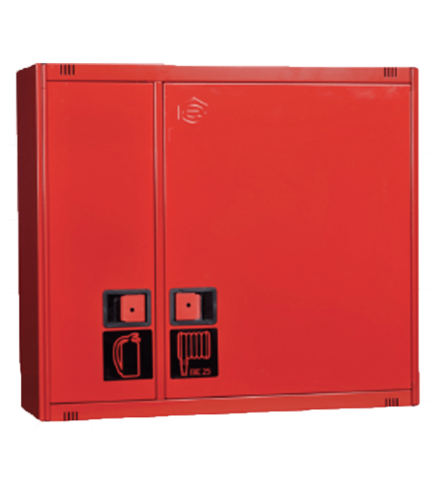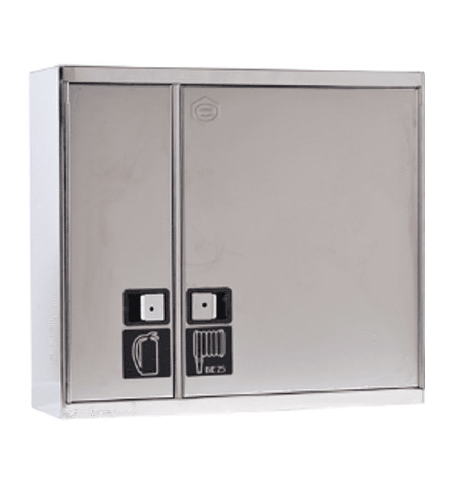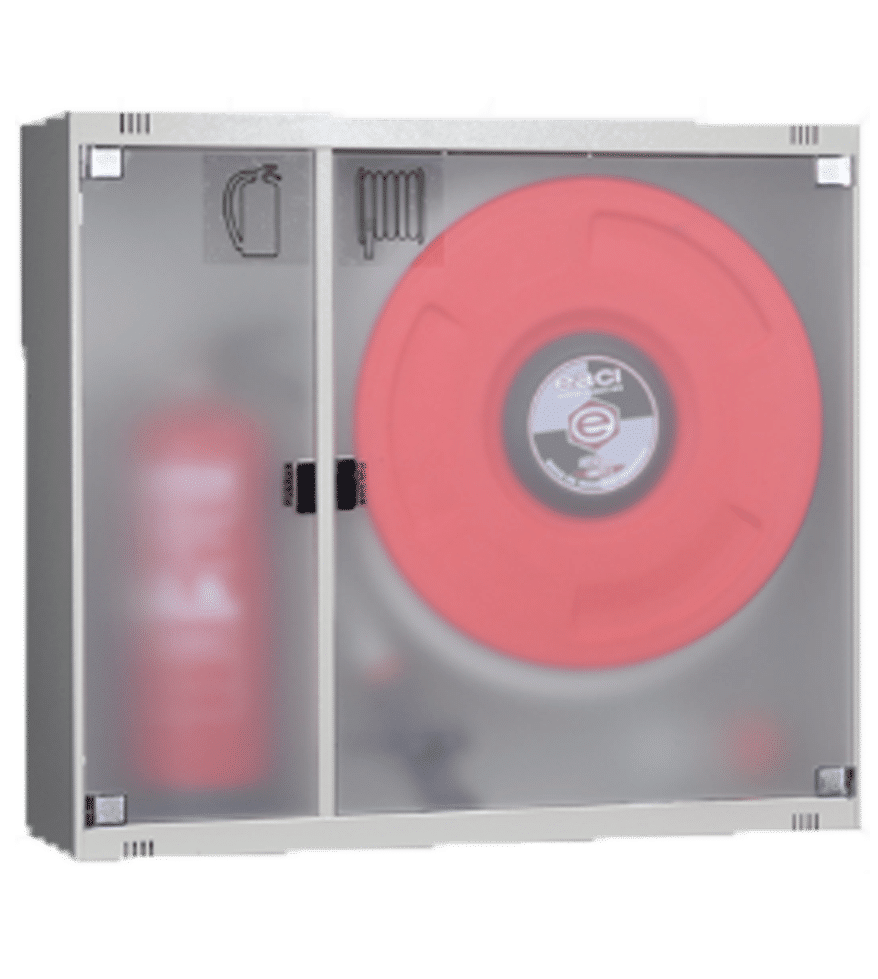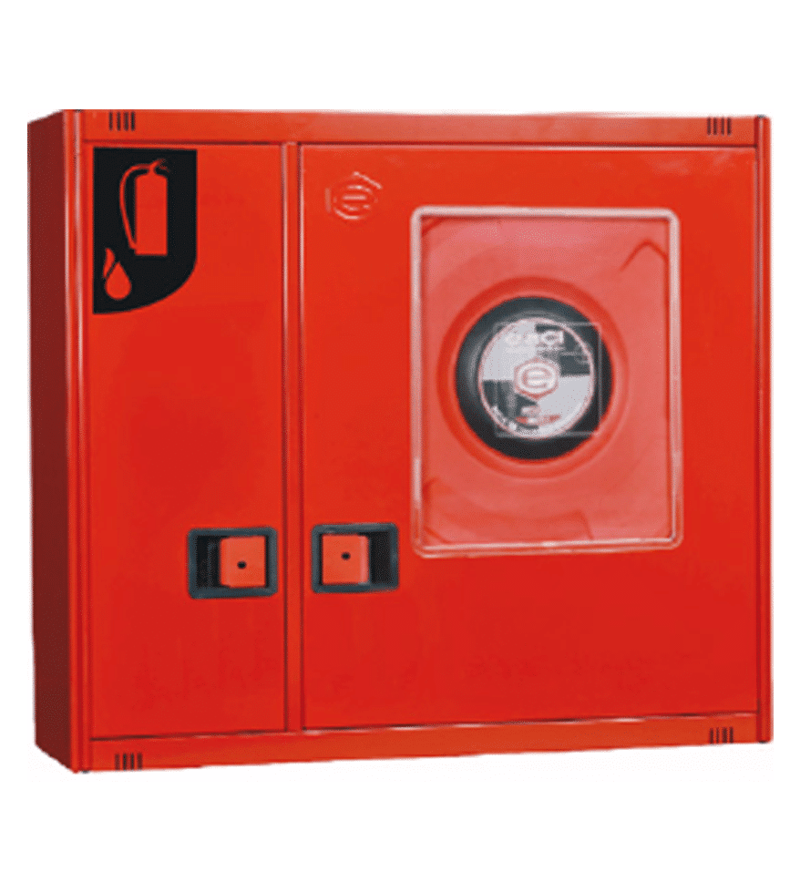 BIE de 25 mm con armario de configuración horizontal fabricado en chapa de acero, con departamento para extintor y posibilidad de instalación con toma adicional.