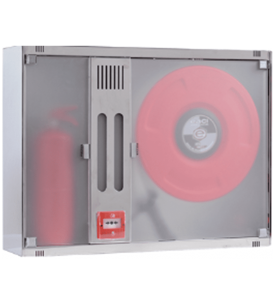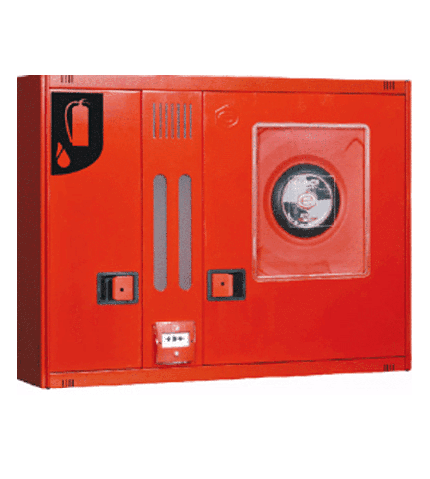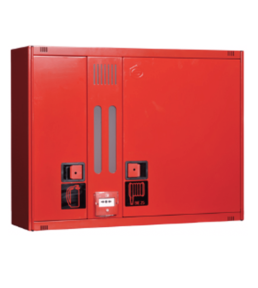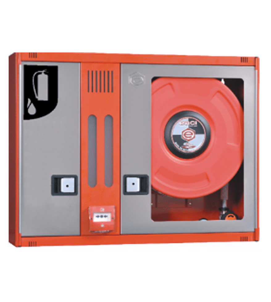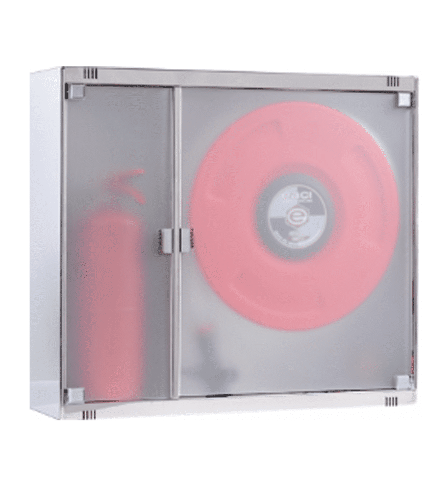 BIE de 25 mm con armario de configuración horizontal fabricado en chapa de acero, con departamento para extintor y posibilidad de instalación con toma adicional.