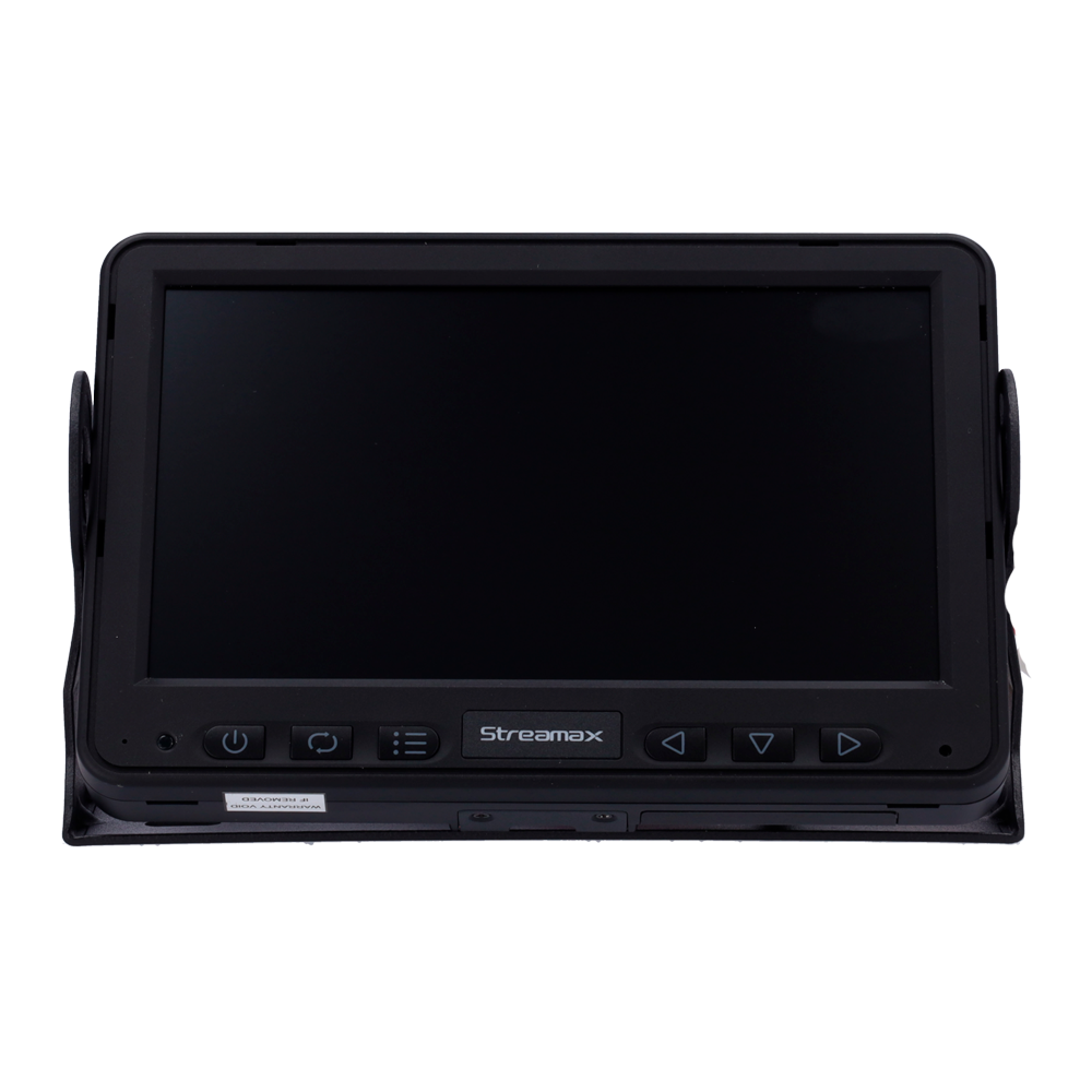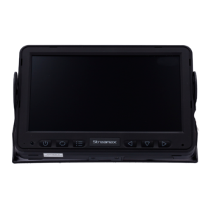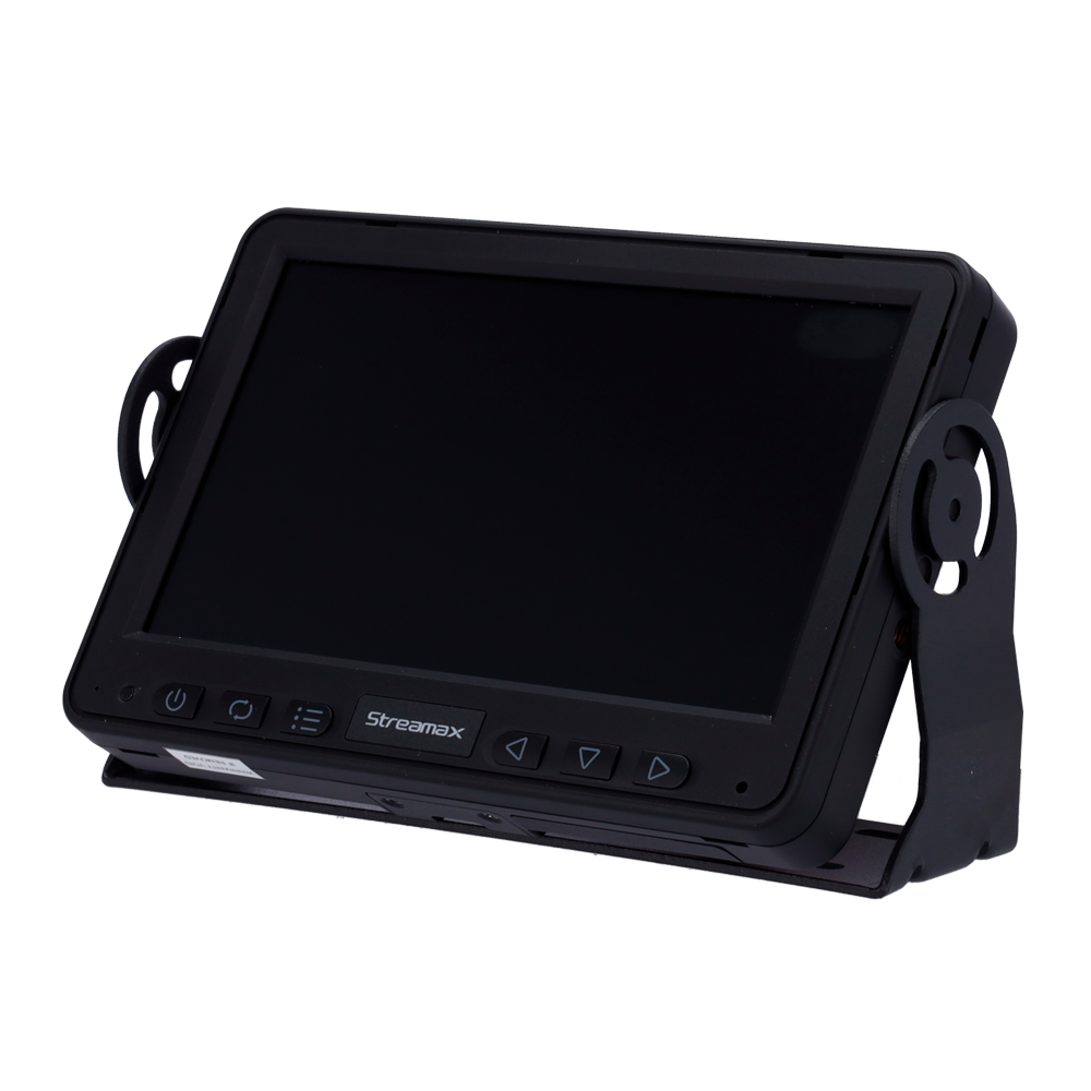 Monitor de 7 pulgadas para grabador y cámaras Streamax. Visión a pantalla completa o Quad, entradas de alarma para popup en directo. Rango de alimentación de 9 a 36V DC.