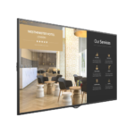 Esta pantalla de gran formato resulta ideal para múltiples aplicaciones: cartelería digital en retail de alto volumen, donde se requiere actualización dinámica de ofertas y promociones; comunicación corporativa en lobbies de edificios empresariales y campus corporativos; señalización informativa en hospitales, universidades y administraciones públicas; videowall y muros de información en centros de transporte; y salas de presentación donde se necesita impacto visual máximo.