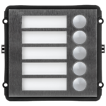Módulo de extensión XS-V2000E-M5B diseñado para ampliar videoporteros modulares de superficie con 5 pulsadores adicionales. Fabricado en aleación de aluminio resistente, ideal para comunidades de vecinos e instalaciones multivivienda que requieren expandir el número de viviendas conectadas sin necesidad de cableado complejo ni alimentación PoE.
