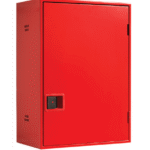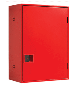 Armario vertical construido en chapa de acero de 1 mm de espesor, pintado en color rojo RAL 3000, de medidas 476 x 660 x 260 mm, con puerta ciega pintada del mismo color, provisto de pretaladro para la entrada de alimentación, manguera, lanza, válvula de asiento, manómetro y latiguillo de alimentación.