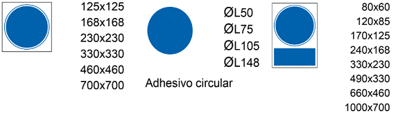 Adhesivo circular, Aluminio 0,8 mm, PVC 0,7 mm, PVC 2 mm, PVC Adhesivo