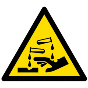 El cartel nos informa de una zona dónde existen líquidos o materiales que al entrar en contacto con la piel o el cuerpo humano producen irritación y problemas. Estar expuesto a ellos pueden causar daños al usuario.