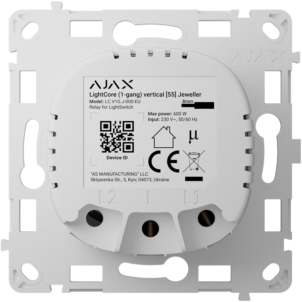 Dispositivo Smart Home Ajax | Tipo: Interruptor / botón | Uso: Iluminación | Protocolo: Jeweller | Alimentación: Red eléctrica | Marca: AJAX | Ref.: AJ-LIGHTCORE-1G-VERT