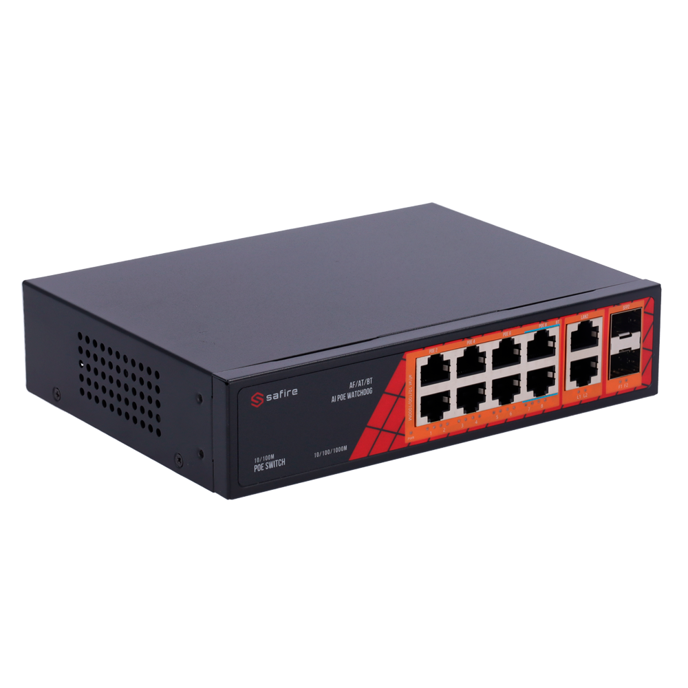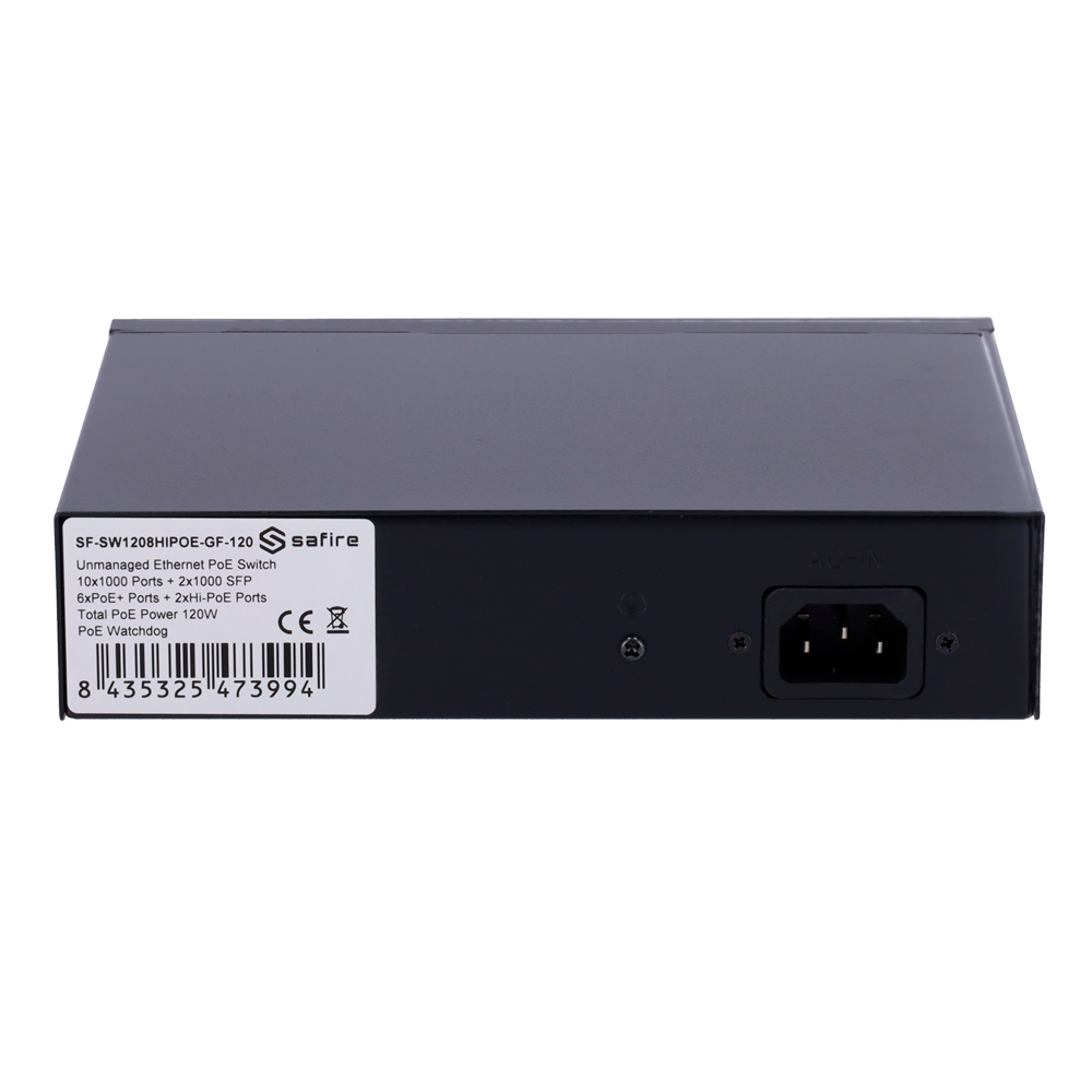Switch Ethernet | No Gestionable | Puertos RJ45: 6 | Velocidad: Gigabit | PoE: Sí | Uplink: SFP | Marca: Safire Smart | Ref.: SF-SW1208HIPOE-GF-120