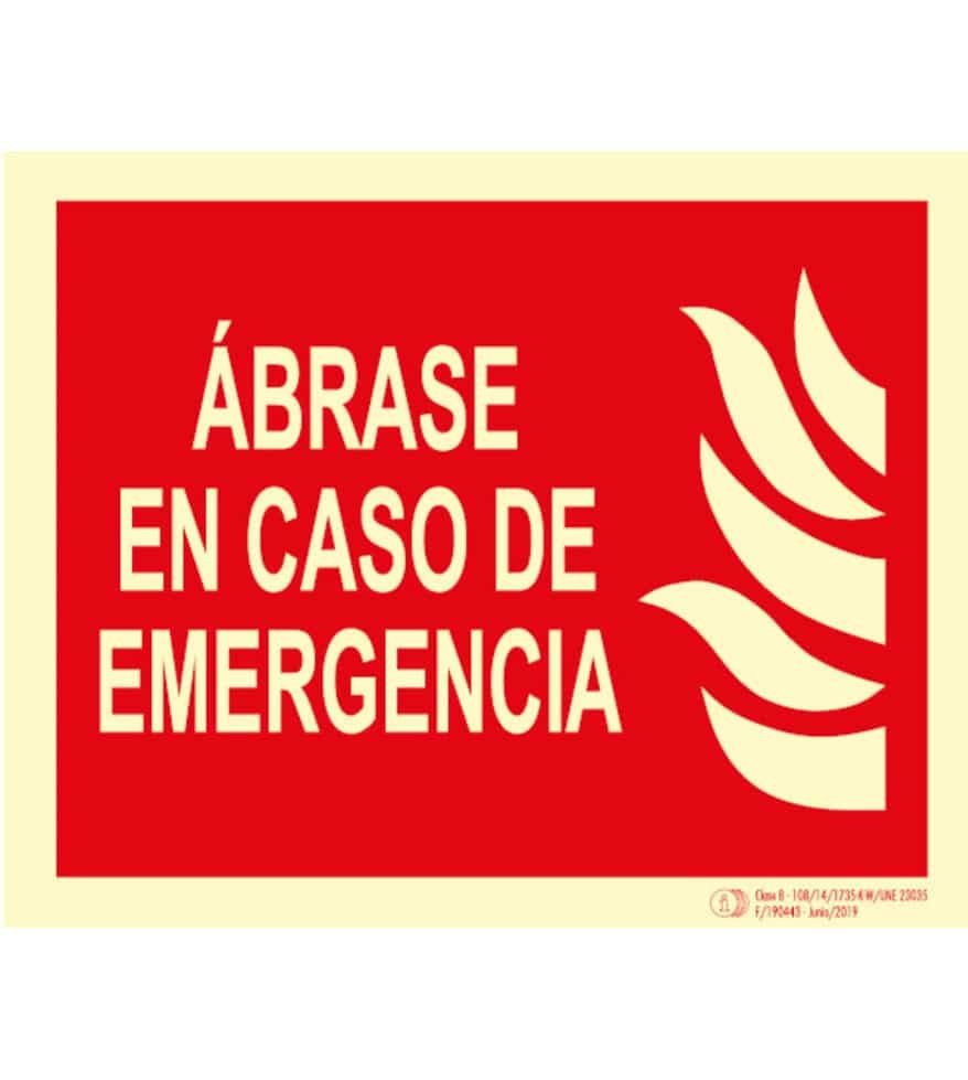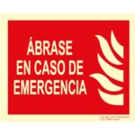 Señal de Ábrase en caso de emergencia. Clase B. Luminiscente. Segun UNE 23035:2003. Disponible en PVC 0,8 mm y Aluminio 0,8 mm.