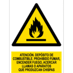 La señal de Atención Depósito de Combustible. Prohibido fumar, encender fuego, acercar llamas o aparatos que produzcan chispas está disponible en material Adhesivo, PVC 0,7 mm, PVC 2 mm y Aluminio 0,8 mm. También tiene varios tamaños a elegir para este mismo producto.