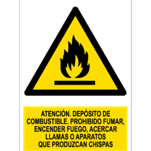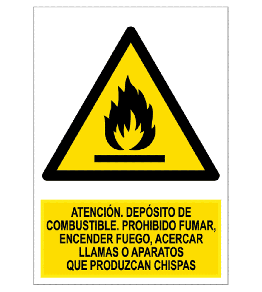 Señal / Cartel de Atención Depósito de Combustible. Homologada. Según UNE 81-501. PVC 0,7 mm, 2 mm. Aluminio 0,8 mm y Adhesivo. Varios tamaños.