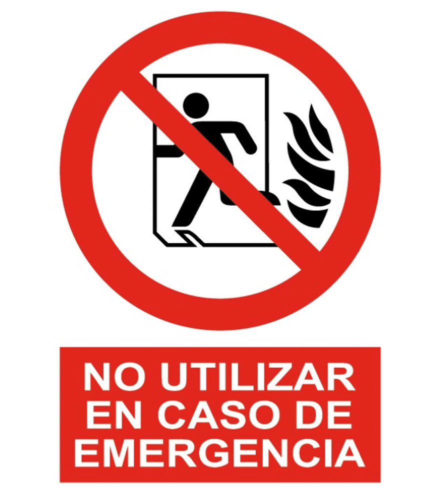 La señal de No utilizar en caso de emergencia está disponible en material Adhesivo, PVC 0,7 mm, PVC 2 mm y Aluminio 0,8 mm. También tiene varios tamaños a elegir para este mismo producto.