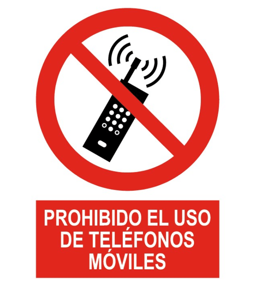 Señal / Cartel de Prohibido el uso de teléfonos móviles. Homologada. Según UNE 81-501. PVC 0,7 mm, 2 mm. Aluminio 0,8 mm y Adhesivo. Varios tamaños.
