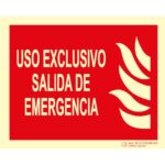 Señal de Uso exclusivo salida de emergencia. Clase B. Luminiscente. Segun UNE 23035:2003. Disponible en PVC 0,8 mm y Aluminio 0,8 mm.