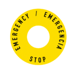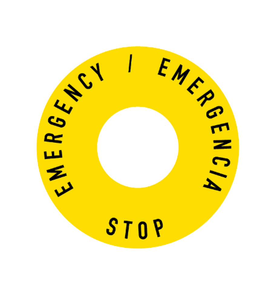 Señal de Botonera. Stop Emergency / Emergencia. PVC 0,3 mm, serigrafiafo. Ø24 int, Ø60 ext (mm).