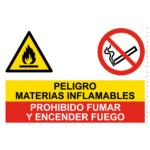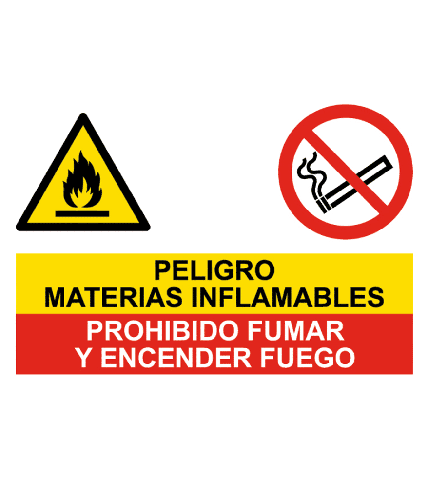 Señal combinada de Peligro materias inflamables y Prohibido fumar y encender fuego. Homologada. Según UNE 81-501. PVC 0,7 mm, 2 mm. Aluminio 0,8 mm. Varios tamaños.