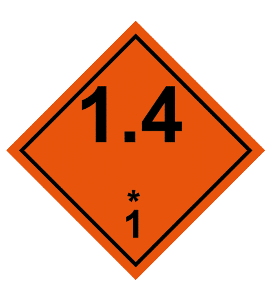 División 1.4.: Materias y objetos que sólo presentan un pequeño riesgo de explosión en caso de ignición o cebado durante el transporte. Los efectos se limitan esencialmente a los bultos y normalmente no dan lugar a la proyección de fragmentos de tamaño apreciable ni a grandes distancias. Un incendio exterior no debe implicar la explosión prácticamente instantánea de la casi totalidad del contenido de los bultos.