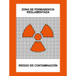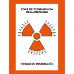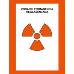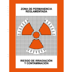 La Zona de permanencia reglamentada es la zona en la que existe el riesgo de recibir em cortos periodos de tiempo una dosis superior a los límites de dosis.. Se señaliza con un trébol naranja sobre fondo blanco.