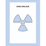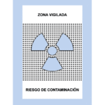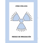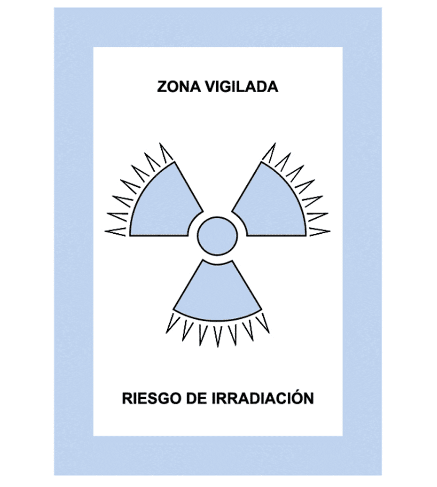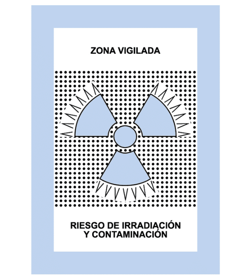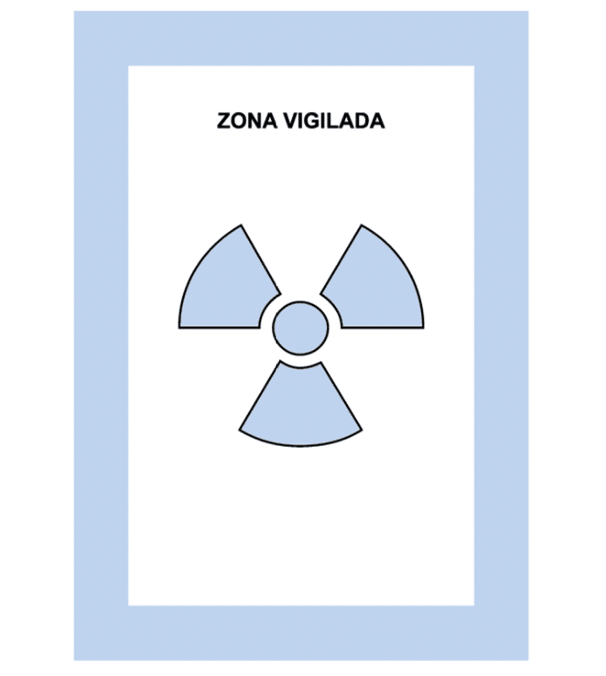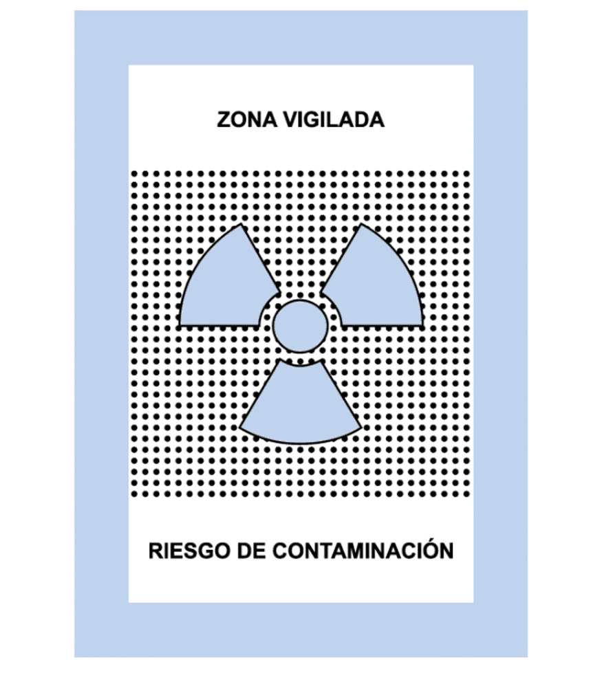 La Zona de vigilada es la zona en la que, no siendo controlada, exista la posibilidad de recibir dosis efectivas superiores a mSv/año oficial o una dosis equivalente superior a 1/10 de los límites de dosis equivalentes para cristalino, piel y extremidades. Se señaliza con un trébol gris/azulado sobre fondo blanco.