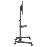 El sistema de ruedas incorpora mecanismos de bloqueo para asegurar la estabilidad del conjunto durante la operación normal, cumpliendo con requisitos de seguridad en espacios de trabajo técnico. La base amplia distribuye el peso uniformemente, reduciendo el riesgo de vuelco incluso con pantallas de gran formato instaladas en altura.