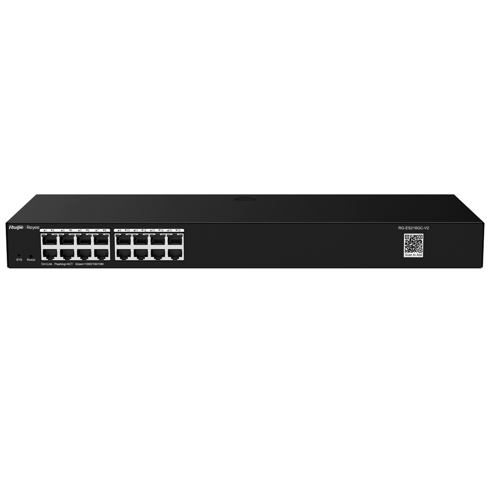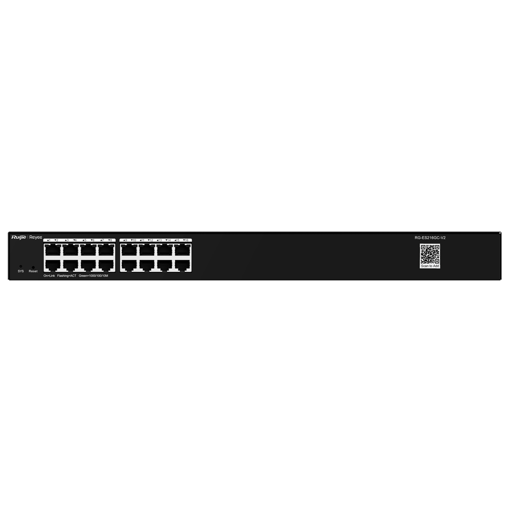 El switch gestionable Reyee RG-ES216GC-V2 representa una solución profesional de conectividad para instalaciones de seguridad electrónica y redes empresariales que demandan rendimiento Gigabit y gestión centralizada. Con 16 puertos Gigabit Ethernet, este dispositivo combina capacidad de conmutación de alto rendimiento con funciones inteligentes de administración cloud, optimizando especialmente el despliegue de sistemas de videovigilancia IP y redes corporativas de mediano tamaño.