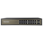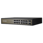 Switch Gigabit de sobremesa SW1816GT-2GF con 16 puertos RJ45 10/100/1000 Mbps y 2 puertos SFP uplink. Diseño Plug & Play sin configuración, ideal para instaladores profesionales que necesitan conectividad rápida y fiable en sistemas de videovigilancia IP, control de accesos y redes de seguridad de pequeño y mediano tamaño.