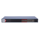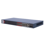 El switch gestionable HIKVISION DS-3E1318P-EI(B) ofrece 16 puertos Gigabit PoE+ con presupuesto de 250W y 2 puertos SFP de fibra, diseñado específicamente para instalaciones de videovigilancia IP, control de accesos y sistemas de seguridad profesionales que requieren alimentación centralizada y gestión avanzada de red.