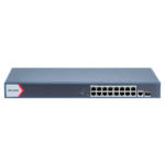 El switch incorpora además puertos SFP (Small Form-factor Pluggable) que permiten conexiones de fibra óptica para ampliar la distancia de transmisión o interconectar con otros switches en topologías de red más complejas. Esta versatilidad facilita el diseño de arquitecturas de red escalables que pueden crecer conforme se expanden las necesidades de videovigilancia del cliente.