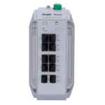 Switch industrial gestionable de nivel 2 con 8 puertos Gigabit PoE+ y 2 puertos SFP, diseñado para operar en condiciones extremas de -40°C a 80°C. Protección contra sobretensiones de 8kV y gestión avanzada mediante Ruijie Cloud, ideal para instalaciones de videovigilancia IP, control de accesos y redes en entornos industriales adversos.