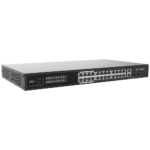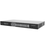 Switch industrial gestionable de 24 puertos Gigabit PoE+ con 1 puerto Gigabit adicional y 1 puerto SFP para fibra óptica. Diseñado para instalaciones de videovigilancia IP y sistemas de seguridad profesionales que requieren alimentación PoE centralizada, gestión avanzada de red y alta disponibilidad en entornos industriales.
