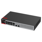 Switch gestionable Layer 2+ Ruijie Reyee modelo RG-S2915-10GT2MS-P-L con 8 puertos Gigabit PoE/PoE+ que proporciona hasta 125W de potencia total. Incluye 2 puertos SFP de 1G/2.5G para uplinks de alta velocidad, ideal para instaladores profesionales que requieren alimentación PoE centralizada para cámaras IP, puntos de acceso y sistemas de seguridad.