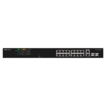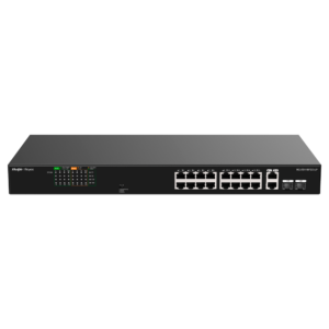 Switch PoE no gestionable de 16 puertos Fast Ethernet 10/100 Mbps con 2 puertos Gigabit SFP, diseñado para instalaciones de seguridad profesional. Gestión inteligente de alimentación PoE, compatible con sistemas de videovigilancia IP y control de accesos. Supervisión remota mediante Ruijie Cloud para instaladores y empresas de mantenimiento.