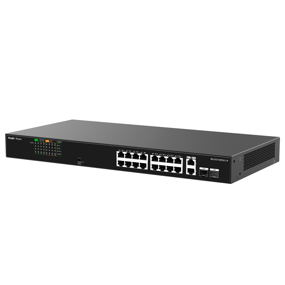El switch PoE no gestionable RG-ES118FGS-LP de Reyee representa la solución ideal para instaladores profesionales que necesitan una infraestructura de red fiable para sistemas de seguridad electrónica. Este conmutador de red ofrece 16 puertos Fast Ethernet 10/100 Mbps con capacidad Power over Ethernet, complementados con 2 puertos Gigabit SFP para enlaces de fibra óptica o conexiones de alta velocidad.