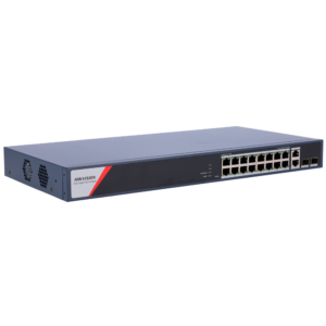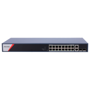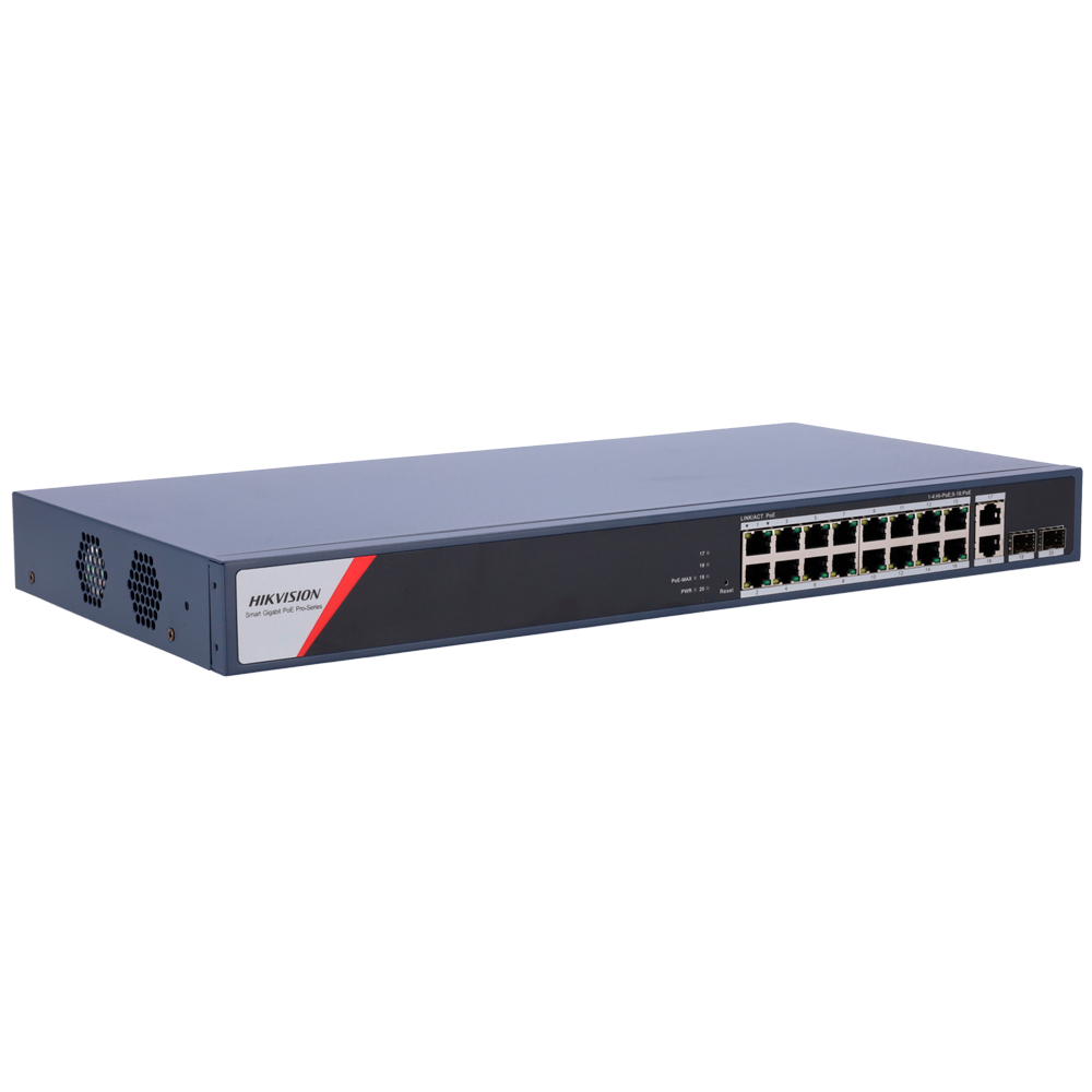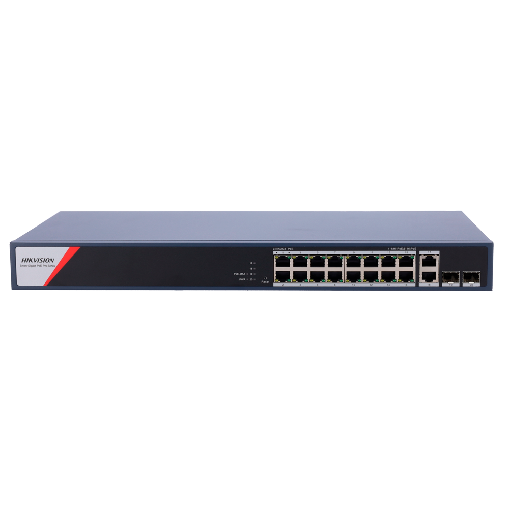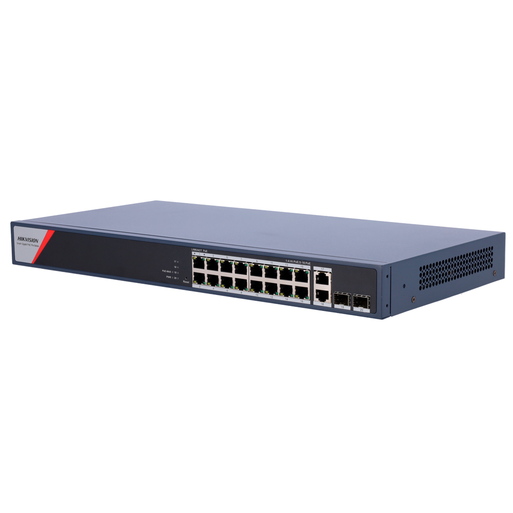 - 16 puertos RJ45 10/100/1000 Mbps PoE + 2 puertos Gigabit RJ45/SFP combo