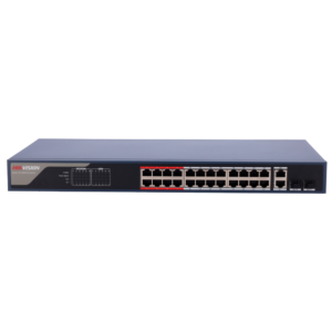 - 24 puertos RJ45 10/100 Mbps PoE + 2 puertos Gigabit RJ45/SFP combo