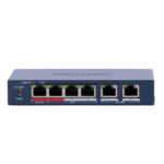 El switch PoE gestionable HIKVISION DS-3E1106HP-EI proporciona 4 puertos Gigabit con alimentación Power over Ethernet, diseñado específicamente para instalaciones de videovigilancia IP y sistemas de seguridad profesional. Ofrece gestión inteligente mediante interfaz web, permitiendo configuración avanzada de VLANs, QoS y monitorización del tráfico de red en tiempo real.
