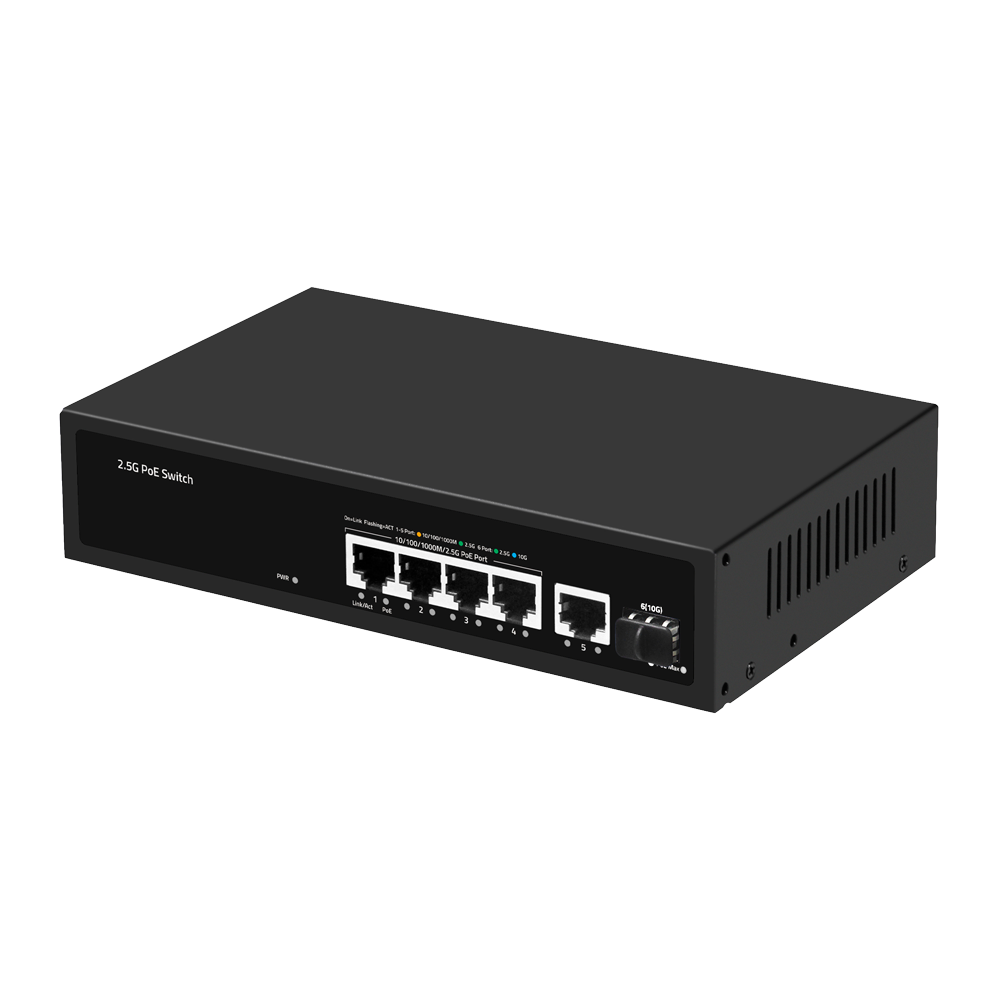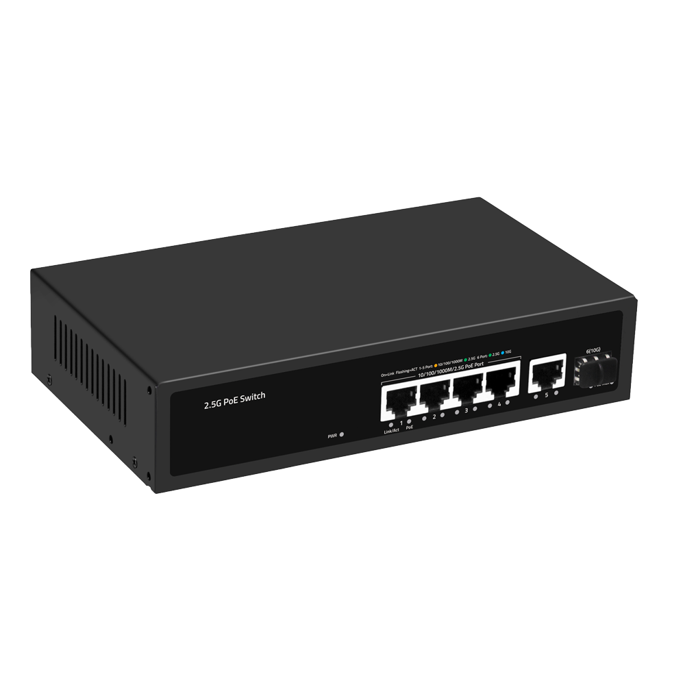 • 4 puertos PoE+ 30W RJ45 Multi-Gigabit 2,5Gbps/1Gbps + Uplink Rj45 Multi-Gigabit 2,5Gbps/1Gbps + Uplink SFP+ 10Gbps