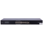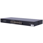 Este switch gestionable proporciona 16 puertos RJ45 10/100/1000 Mbps con capacidad PoE+ según estándar IEEE 802.3af/at, ofreciendo hasta 30W por puerto y un presupuesto total de potencia de 250W. Incorpora además un puerto Gigabit adicional y un puerto SFP para conexión de fibra óptica, permitiendo enlaces de larga distancia o conexiones troncales de alta velocidad hacia el núcleo de la red.