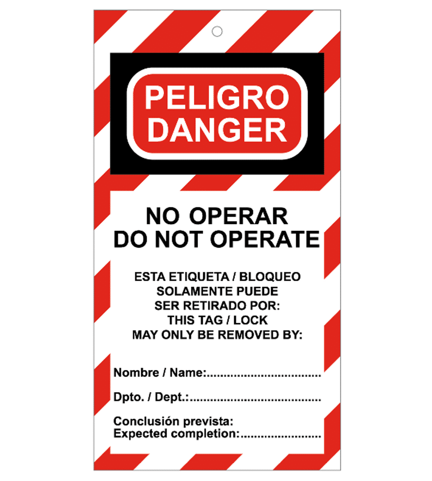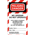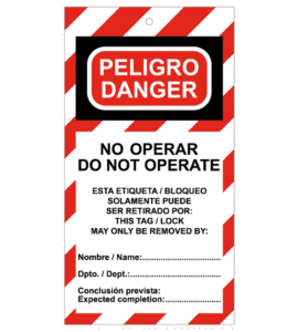 La Tarjeta de bloqueo de Peligro. No operar está disponible en material PVC 0,3 mm. Medidas 200×100 mm. A una cara.