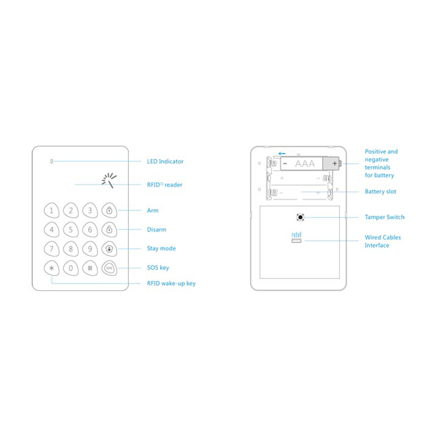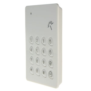 Teclado independiente para armado/desarmado del sistema de alarma. Es compatible con el panel de alarma, se comunica inalámbricamente con éste, y permite armar la alarma a través de su teclado numérico, y desarmarla a través del mismo teclado numérico o a través de llaveros de proximidad.